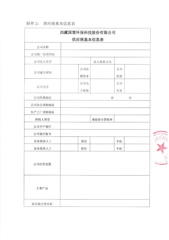 供應(yīng)商將資料整理成冊(cè)并每頁蓋章后掃描為PDF文件,發(fā)送至西藏國(guó)策環(huán)保科技股份有限公司采購(gòu)郵箱:cg@guoce.com。